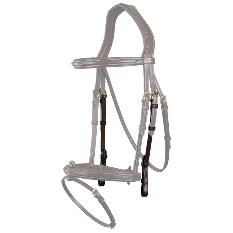 The Dy’on Collection Cheekpieces are available in different sizes to make up a new bridle and to replace broken parts. Crafted from Grade 1 Catalan European cow leather and finished with fancy cream stitching and brass buckles.