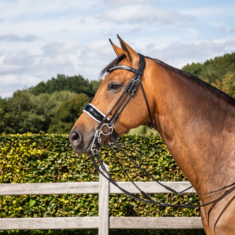 The noseband boasts a supple anatomical shape with a pull-back closure mounted on a protective padded backing. At 38mm wide, the noseband boasts a classy white lining, sure to make you stand out.