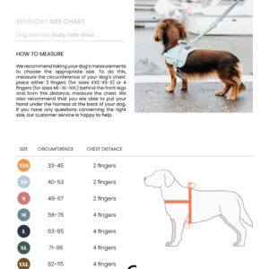 This harness is available in seven different sizes. We recommend taking your dog’s measurements to choose the appropriate size. To do this, measure the circumference of your dog’s chest: place either 2 fingers (for sizes XXS-XS-S) or 4 fingers (for sizes ML-XL-XXL) behind the front legs and from this distance, measure the chest. We also recommend that you are able put your hand under the harness at the back of your dog. When fitting, make sure these distances are respected in order to give your dog maximum freedom of movement.