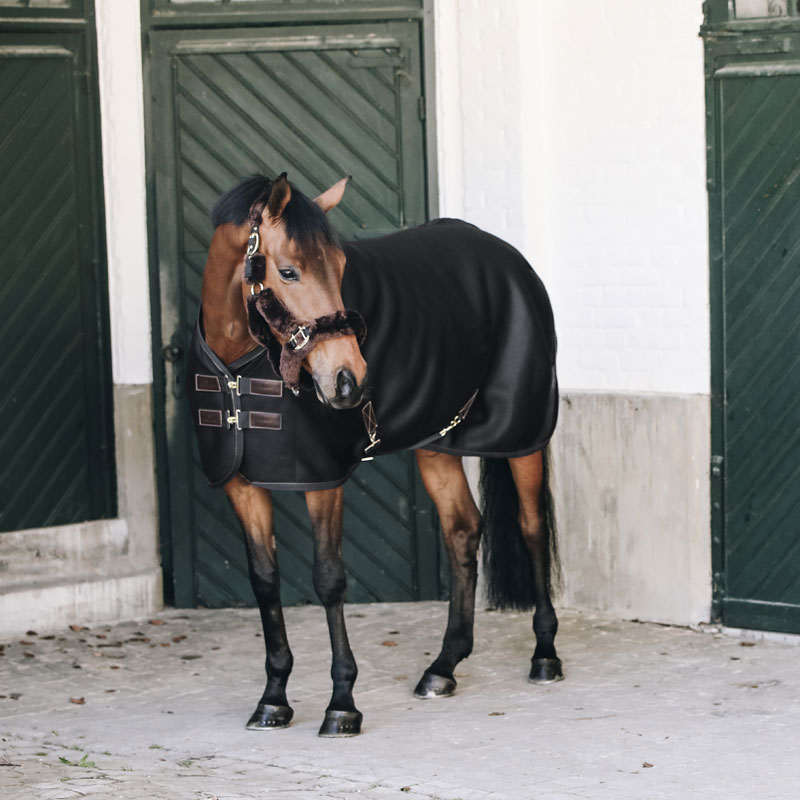 The artificial sheepskin protects the withers. The brown artificial leather piping and the Kentucky logo in brown artificial leather give the 3D Spacer Cooler Sheet a very fancy and stylish look.