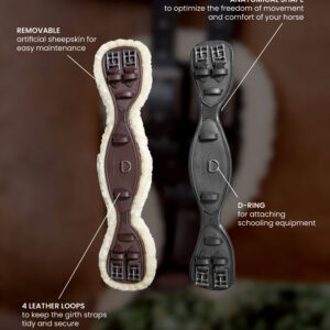 The anatomic design of this short girth sets it apart, ensuring optimal comfort and performance for your horse. By freeing the elbows, it reduces pressure and promotes unhindered movement, making it especially suitable for horses requiring extra mobility. The additional leather loops keep the girth straps neat and secure, offering a polished look during training or competition. Its durable artificial leather construction, combined with nylon reinforcement, guarantees long-lasting reliability, even with regular use.