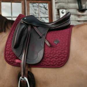 The outside of the saddle pad is made from a cotton-like polyester in a chic cube quilting design. On the left side of the saddle pad is a small artificial leather patch with the Kentucky logo, under the logo there’s enough space for embroidery. The lining of the saddle pad is a moisture-wicking cotton-polyester mix.