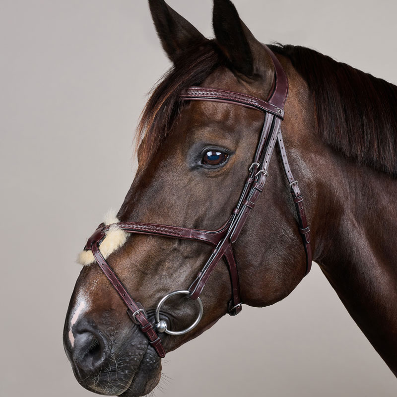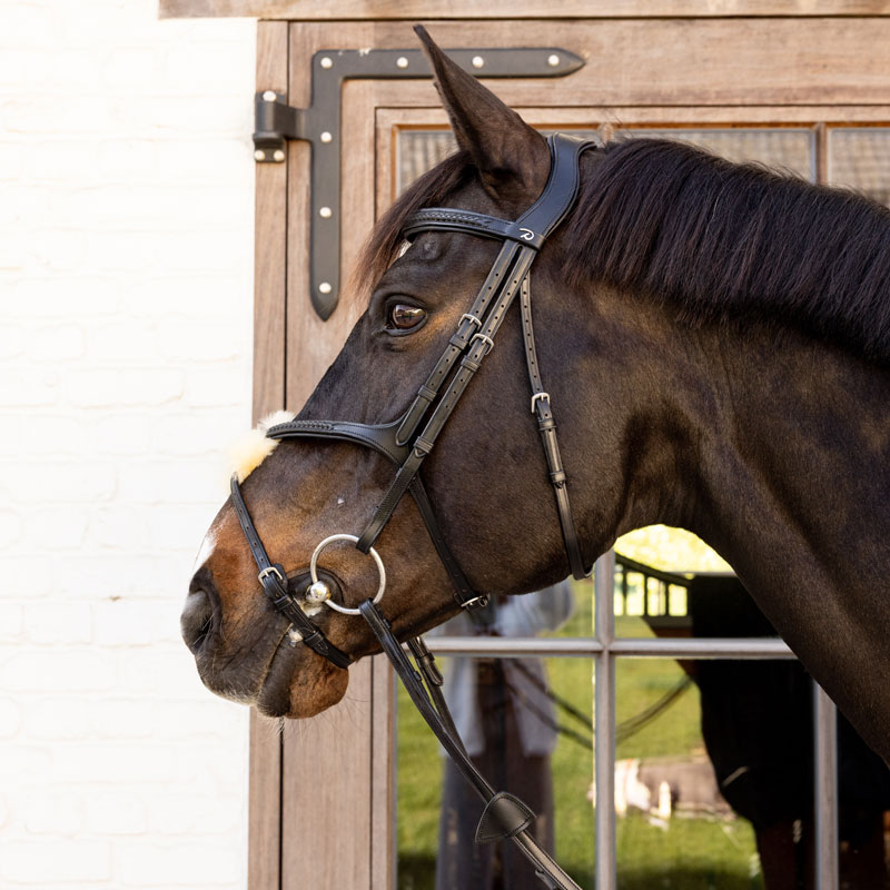 The straight browband is finished with sophisticated plaited leather detailing, perfectly complementing the noseband for a cohesive, timeless look. The S-shaped headpiece is carefully contoured to allow the horse’s ears complete freedom of movement, reducing pressure at sensitive points and promoting relaxation. Additionally, the cheek buckles are positioned below eye level, helping to maintain a clear field of vision and encouraging natural movement.
